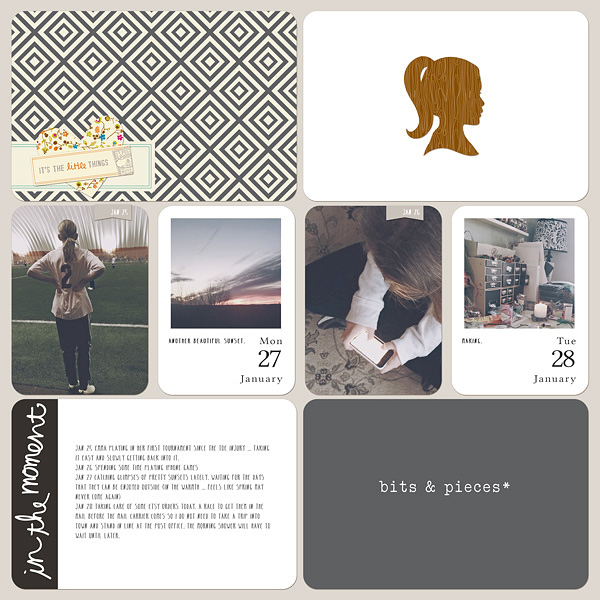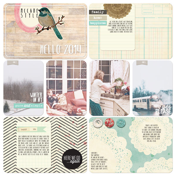 Today I want to share some more Digital Project Life pages from Weeks 3 & 4 for 2014. I am still using my Collect App to organize and keep track of all my daily photos. I still use my PicTapGo App and apply my custom recipe to my photos … so they all have the same look throughout my pages (and my entire book for the year). And I am settling in to my 2014 style for my PL pages this year. Basic white, plain background, and very little fuss and extras. I want the photos and the journaling to tell the story of our everyday moments.