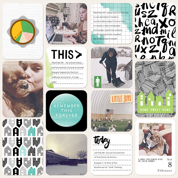 There is lots of white and black … with the trendy handwritten brushed look, bold colors that can be be used for a really bright layout or toned down with just bits of color depending on which journal cards you use, and just the funnest little sayings & artwork. I think it is safe to say I am GAH, GAH over this kit.